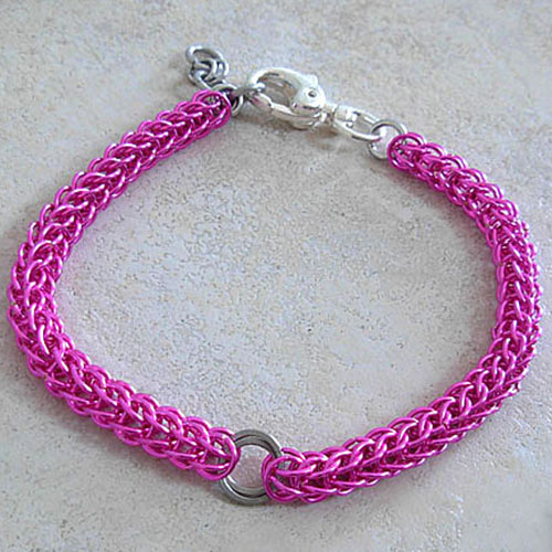 It is hand-woven in Pink anodized aluminum wire one ring at a time.