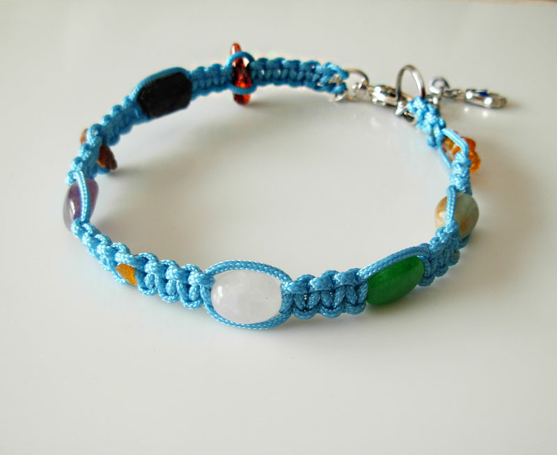 PC017 - Stylish healing 6 gemstones dog necklace to aid Fear Anxiety Aggression, Barking This stylish healing dog necklace is hand-woven from waxed cotton cord. It is strong and durable yet soft and comfortable. Genuine gemstone crystals are interwoven to address the specific issues of your dog. The closure is a silver plated swivel clasp with an extender of 3 cm (1 inch). Finished with genuine leather to secure closure.